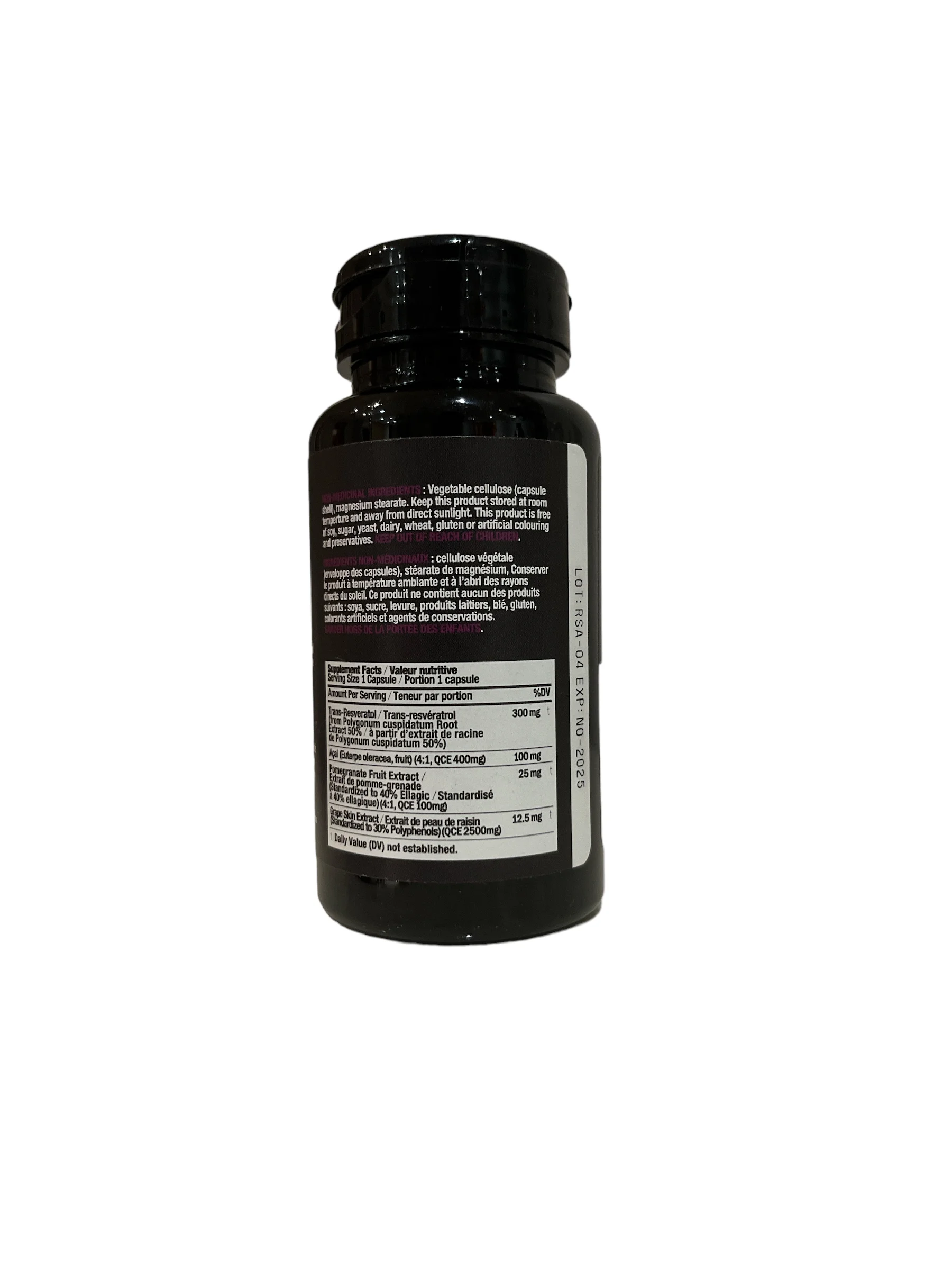 Une formule antioxydante unique à base de resvératrol conçue pour favoriser un vieillissement sain, la longévité et une bonne fonction pulmonaire grâce aux bienfaits combinés de l’extrait de vin rouge, de la grenade et de l’açai.